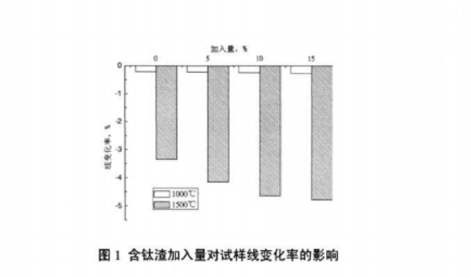 圖2所示為音鈦渣加入量對(duì)試樣顯氣孔牢、體積密度的影響。由圖可以看出.在熱處理后,試樣的 顯氣孔率和體積密度隨者含鈦渣的增加而呈現(xiàn)明顯的變化規(guī)律。試樣的顯氣孔率隨含鈦渣的增加而下 降,體積密度隨著含鈦渣的增加而上升。添加了古鈦渣的試樣相比空白樣而占,其顯氣孔牢有明顯的下 降,體積密度顯著增加.尤其是在1500℃的高溫處理后.舍釷渣試樣和空白樣的顯氣孔率和體積密度差 異明顯,這與上部分對(duì)試樣的線盤化率的影響分析相對(duì)應(yīng)。隨著熱處理溫度的升高,試樣的顯氣孔率減 小,體積密度相應(yīng)增大,明顯是含鈦渣的促燒原因。