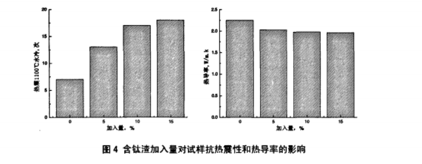 圖4所示為含鈦渣添加量對(duì)試樣抗熱震性和1000℃時(shí)熱導(dǎo)率的影響。由圖可以看出,含鈦渣的加入 明顯提高了試樣的抗熱震性,降低了試樣的熱導(dǎo)率,且隨著含鈦渣加入量的增加熱震次數(shù)呈上升趨勢(shì)、 熱導(dǎo)率呈下降趨勢(shì)。但隨著含鈦渣加入量增加,試樣的抗熱震性和熱導(dǎo)率改善趨緩,這可能是由于試樣 中雖有大量鈦酸鋁形成且量逐步增大,但試樣由于燒結(jié)好而致密化導(dǎo)致了未現(xiàn)明顯改善趨勢(shì)。