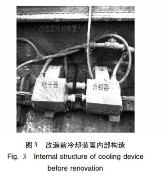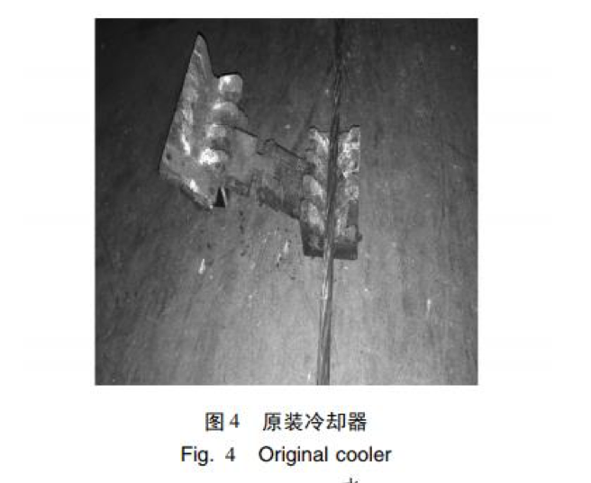 長期生產(chǎn)運(yùn)行中,發(fā)現(xiàn)中頻爐兩端原 裝的冷卻裝置冷卻效果不佳,既影響產(chǎn)品質(zhì)量,又易 造成鋼絞線整根斷裂,存在極大的安全隱患,對人身 和設(shè)備造成傷害。 正常生產(chǎn)的鋼絞線經(jīng)冷卻后溫度不高于 60 ℃[4],而經(jīng)中頻爐自帶的冷卻裝置一次自動冷卻后 的鋼絞線溫度仍然過高,約 150 ℃ 左右[5],如果此 時生產(chǎn)線啟動,將對此部分鋼絞線進(jìn)行二次加熱,由 于溫度疊加,造成溫度急劇上升,使鋼絞線加熱溫度 過高,在 30% ~ 50% 抗拉強(qiáng)度的張拉力作用下易造 成鋼絞線整根斷裂。為避免此現(xiàn)象發(fā)生,必須由人 工操作,將中頻爐在位置1 與位置2 之間行走2 至3 次,才能將鋼絞線的溫度降至 60 ℃以下。這樣操作 既浪費(fèi)時間也降低生產(chǎn)效率。而且由于需要反復(fù)多 次冷卻,中頻爐冷卻器、吹干器等相關(guān)部件使用頻次 增加,維護(hù)成本提高。 經(jīng)反復(fù)查找,發(fā)現(xiàn)中頻爐原裝的冷卻裝置( 圖 3) 冷卻效果差與其冷卻器( 圖 4) 有關(guān),原設(shè)計冷卻器與吹干器為銅制合頁式交錯咬齒形結(jié)構(gòu),該設(shè)計 存在以下問題: ( 1) 采用噴淋式冷卻,冷卻面積小。 ( 2) 冷卻器短,長度只有 135 mm。 ( 3) 冷卻水流量小,只有 16 個直徑為 1 mm 的 出水口。 ( 4) 冷卻器數(shù)量少,受設(shè)備總體布局的約束,中 頻爐兩端分別有一個冷卻器。 ( 5) 工作環(huán)境高溫、高油煙,冷卻器出水孔易堵 塞,不能正常工作。 ( 6) 生產(chǎn)線停止運(yùn)行時,中頻爐由位置 2 向位 置 1 移動過程中,由于鋼絞線沒有張力,受重力作用 鋼絞線自然下垂造成冷卻器磨損。由于冷卻器結(jié)構(gòu) 復(fù)雜難加工,因此制造成本高。