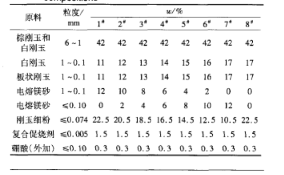 以電熔棕剛玉、白剛玉、板狀剛玉、鎂砂為顆粒料,鎂砂細粉、剛玉細粉為粉體,添加高溫復合促燒劑,以硼酸為外加劑。主要原料的化學組成如表1所示。