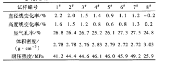 將所有試樣分別在1000、1200、1350和1600cI=熱處理3h后,觀察其燒結(jié)情況,同時將經(jīng)l350oC3h燒后的試樣4A一_4F再經(jīng)1600oC3h熱處理。對1600℃3h燒后的各試樣進行直徑線變化率和高度線變化率(GB/T3997.1一l998)、體積密度(GB/T2997-2000)以及耐壓強度(GB/T5072-2008)檢測,同時并對現(xiàn)場使用后的干式搗打料殘襯進行顯微結(jié)構觀察。