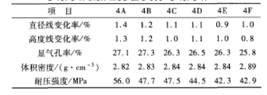 經(jīng)l350oC3h預燒后的試樣4A-_4F再經(jīng)1600℃3h燒后的性能檢測結(jié)果見表5。由表5可見,隨復合促燒劑加入量的減小,試樣的直徑線變化、高度線變化、耐壓強度在逐漸減小,體積密度在逐漸增加。綜合比較而言,試樣4c的強度較高,線變化比較合理,該試樣在1000以下燒后幾乎無強度,呈粉狀,1200oC燒后稍微有點強度,1350oC燒后有一定的強度,1600oC燒后有較高的燒結(jié)強度,可以滿足中頻爐搗打料各方面要求。因此,選擇4c配比作為工業(yè)現(xiàn)場試驗用干式搗打料的配比。