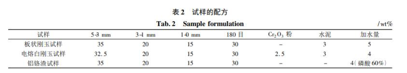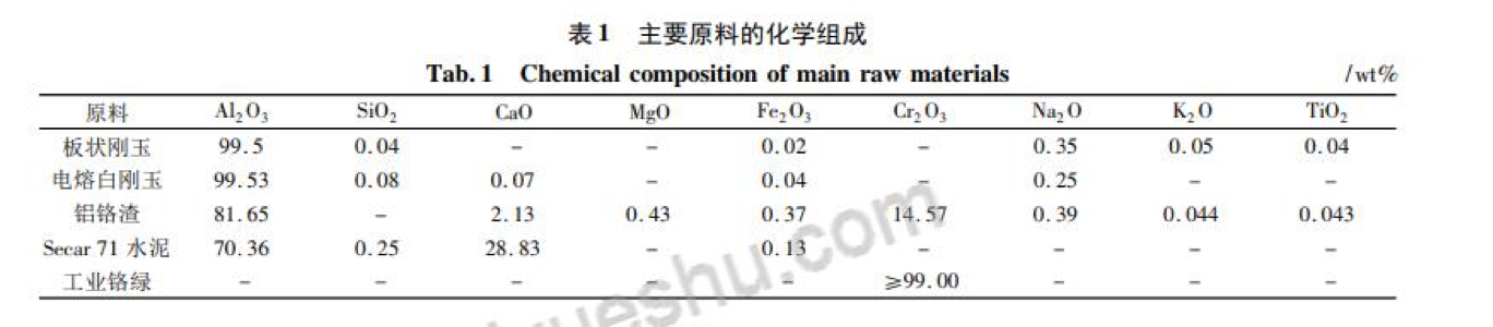 實(shí)驗(yàn)用主要原料有板狀剛玉( 5 ~ 3 mm、3 ~ 1 mm、1 ~ 0 mm 和≤0. 088 mm) 、電熔白剛玉( 5 ~ 3 mm、3 ~ 1 mm、1 ~ 0 mm 和≤ 0. 088 mm) 、鋁鉻渣( 5 ~ 3 mm 、3 ~ 1 mm、1 ~ 0 mm 和≤ 0. 088 mm) 、純鋁酸鈣水泥( Secar 71) 、磷酸溶液( 濃度 60% ) 和工業(yè)鉻綠。板狀剛玉體積密度 5. 53 ~ 5. 57 g·cm - 3,吸水率為 1. 0% ~ 1. 09% ,顯氣孔率約 4. 1% ~ 4. 8% ; 電熔白剛玉體積密度 3. 54 ~ 3. 70 g·cm - 3,吸水率為 2. 43% ~ 2. 58% , 顆粒料的顯氣孔率約 6. 1% ~ 7. 4% ; 鋁鉻渣顆粒體積密度為3. 29 ~ 3. 37 g·cm - 3,吸水率為 4. 2% ~ 4. 6% , 顯氣孔率 10. 3% ~ 12. 1% 。原料的化學(xué)組成見表 1。