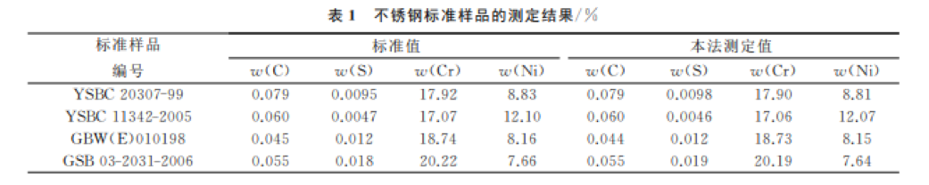 選?。磦€(gè)不銹鋼標(biāo)準(zhǔn)樣品,按本方法分析步驟進(jìn)行測(cè)定,結(jié)果如表1所示。